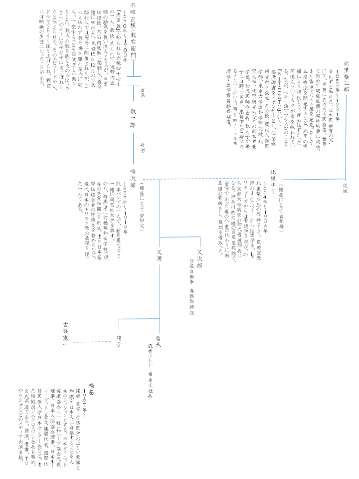 (曾祖母が柴三郎の従妹で、京都大学病院初代看護師長として近代医療の発展に努めた北里ゆう、その夫=曽祖父は同志社大学の創始メンバーで、日本にプロテスタントを広めた不破唯次郎)